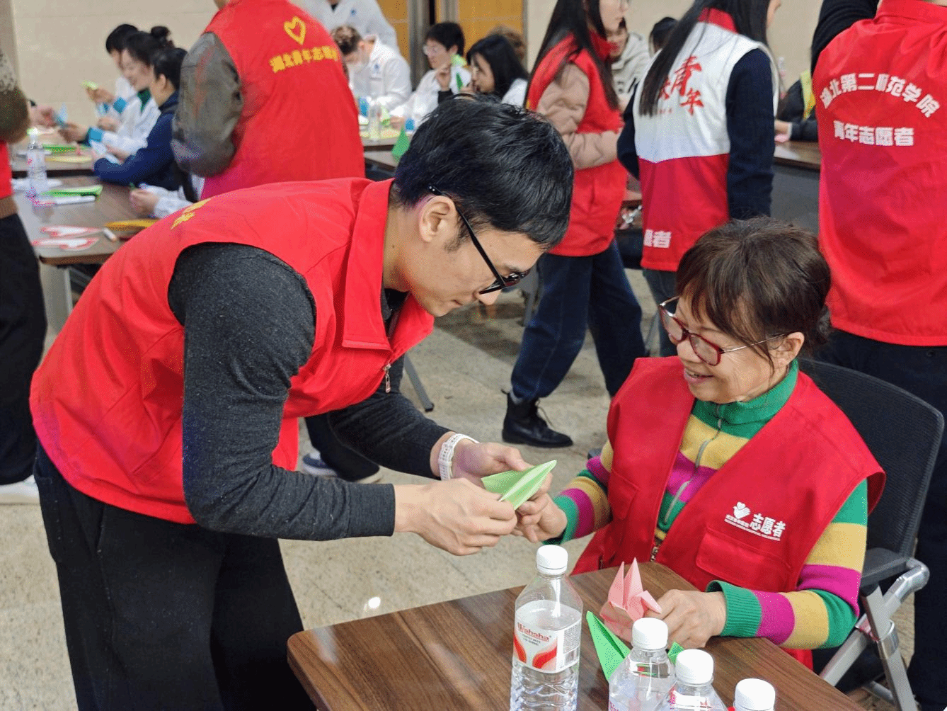 快闪科普作为本次志愿活动的核心亮点,由韩佳茂结合自身专业素养深度主导。他将慢性病科普与肢体减脂动作深度融合,用欢快有感染力的快闪表演为大家抚平焦虑、舒缓疲惫,科普知识记忆深刻。随后,志愿者们带领大家进行音乐疗愈,开展折千纸鹤寄心愿、扎气球释压力等互动活动,在轻松愉快的氛围中帮助大家告别负面情绪,现场暖意融融。